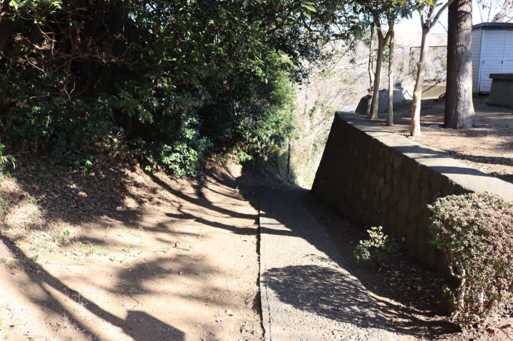 現在は道路が通って登り坂となっていますが、当時は三崎城を東西に分かつ大きな空堀が築かれていました。