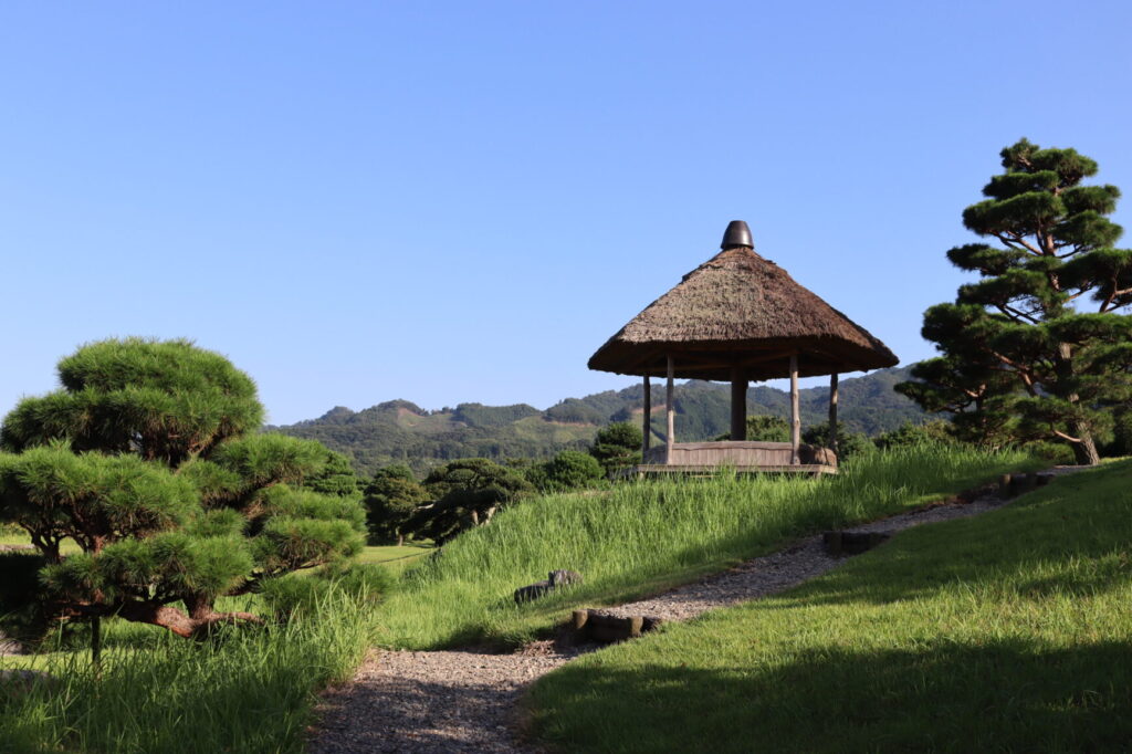 屋根が茅葺き、庇が杮葺きの襖がある建物で、藩主が庭園の景色を楽しんだ場所です。