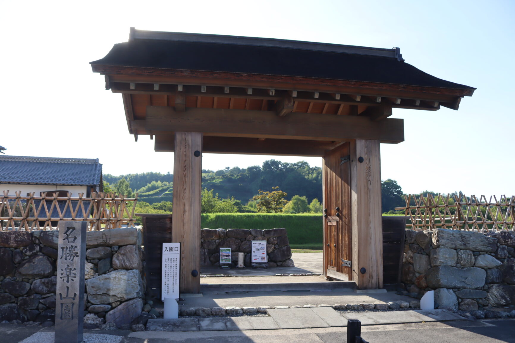 楽山園の入口には門と塀が建てられています。