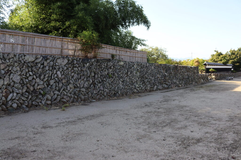 石垣は御殿前通りや中小路に残されていて、矢羽積みと呼ばれ最上段を大きな石で押さえるのが特徴的です。