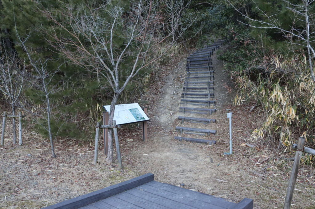 木津城西側の主郭麓に木津城の登り口と説明板が設置されています。