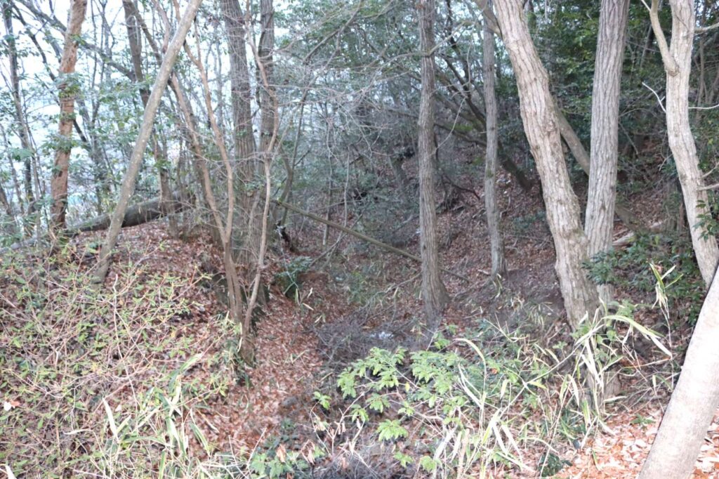 階段を登って行くと主郭外周部に築かれていたと思われる、空堀跡が見受けられます。