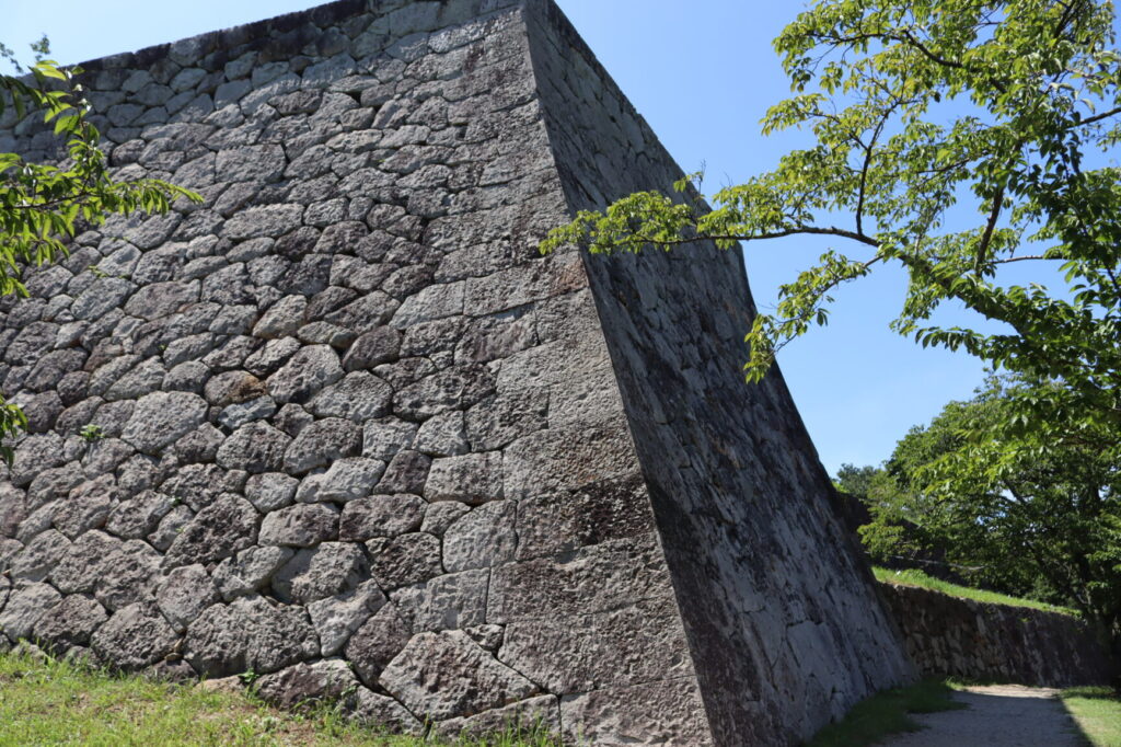 四重櫓の石垣は天守台の石垣よりも接合面が綺麗に加工されていて、特に算木積みの角部分が鋭く勾配も急となっています。