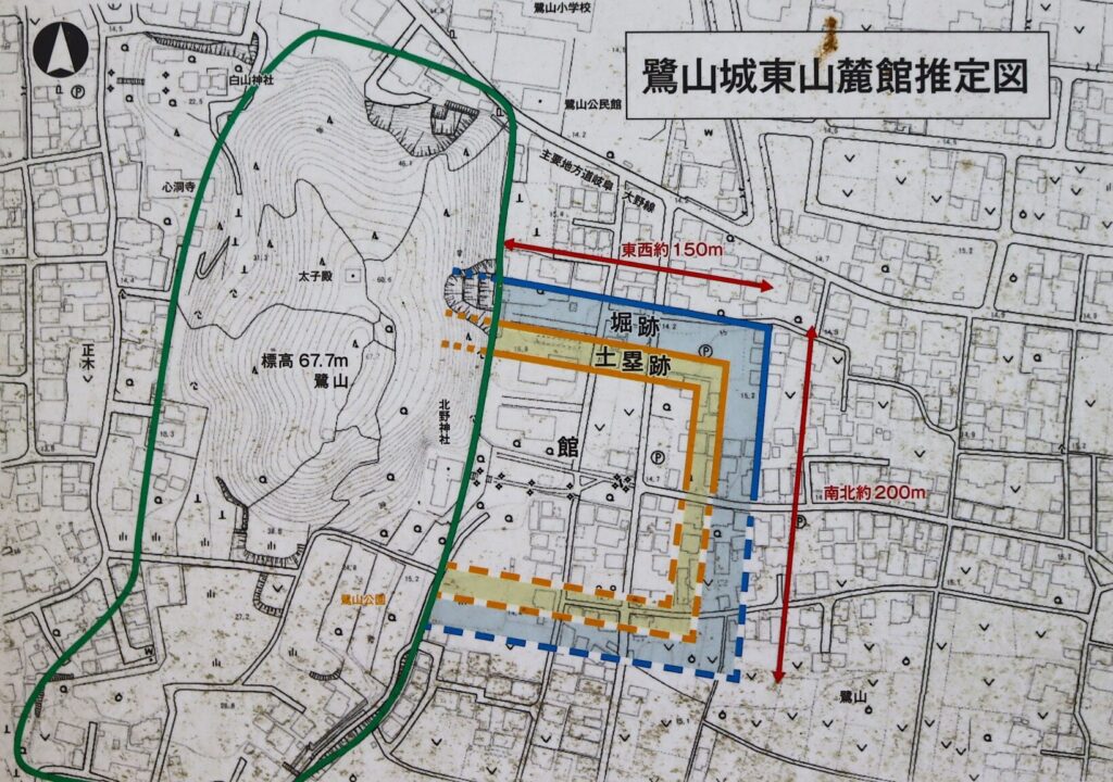 東側山麓部には東西150m、南北200mの方形の館跡があったと考えられています。