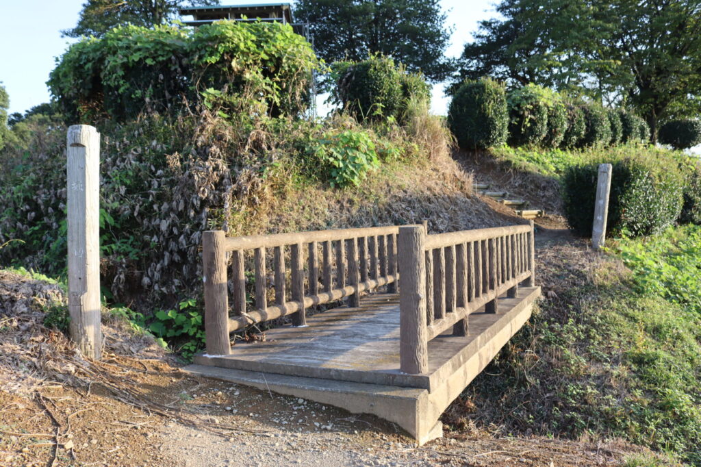 現在は空堀に小さな橋が架けられていて、西側の斜面へと繋がっています。