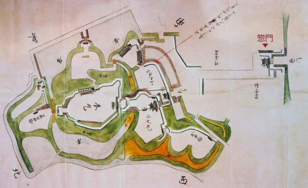 発掘調査と絵図により17世紀中頃に石垣が築かれた事が確認され、絵図に二層の門が描かれています。